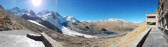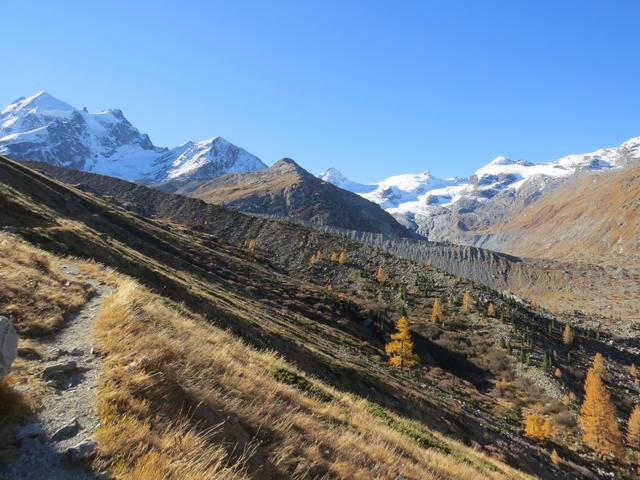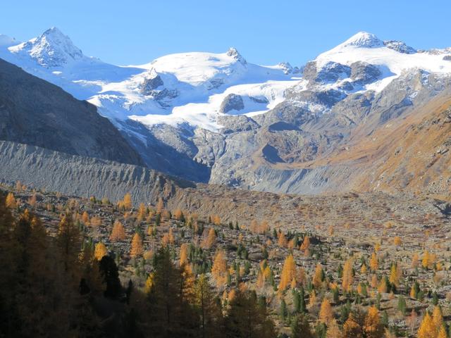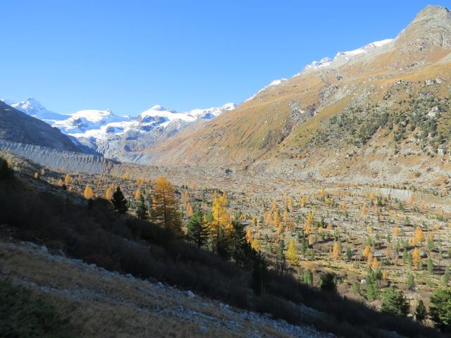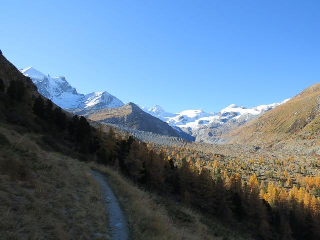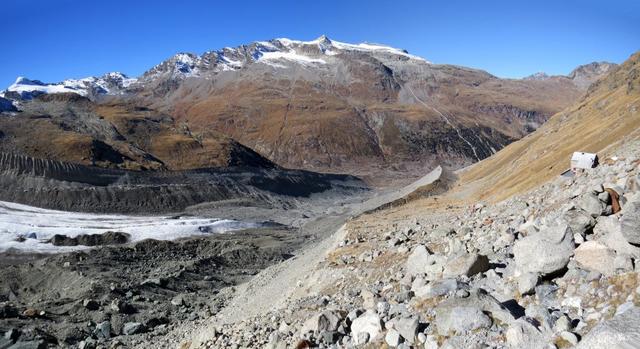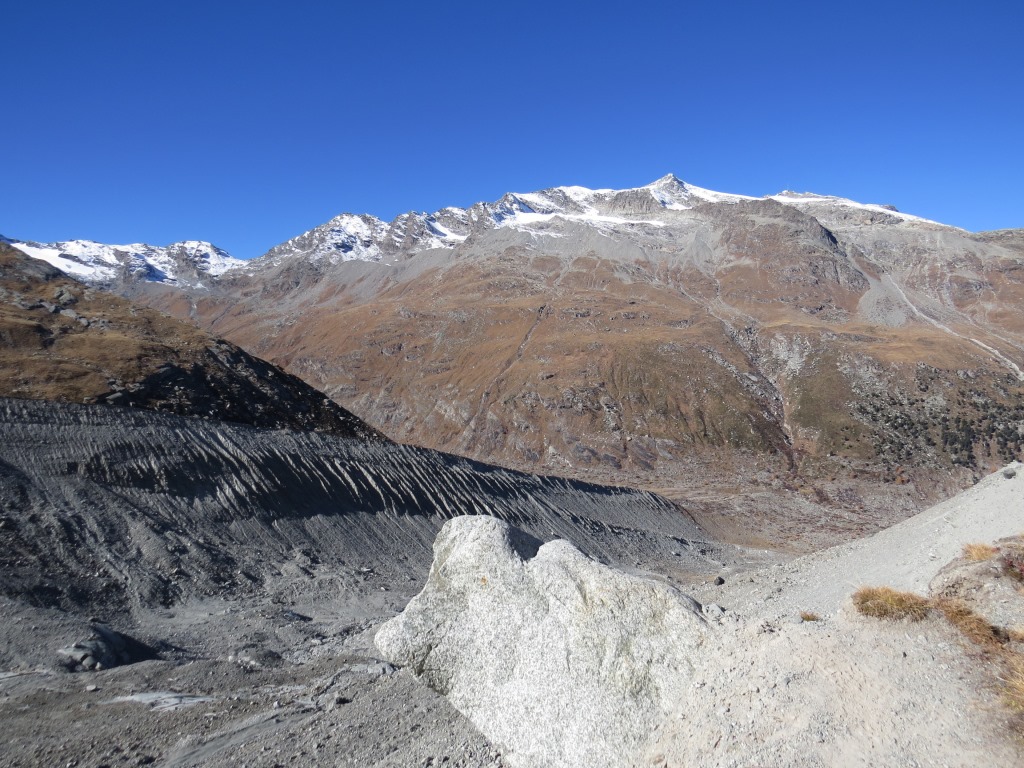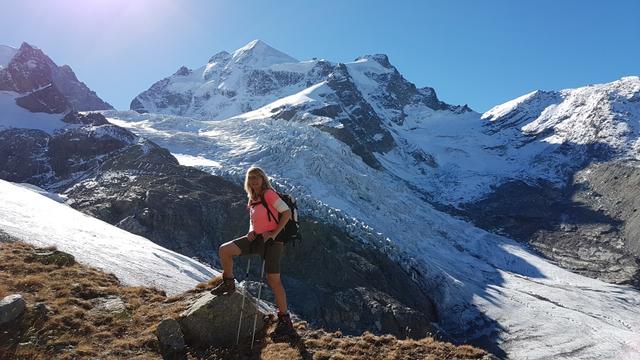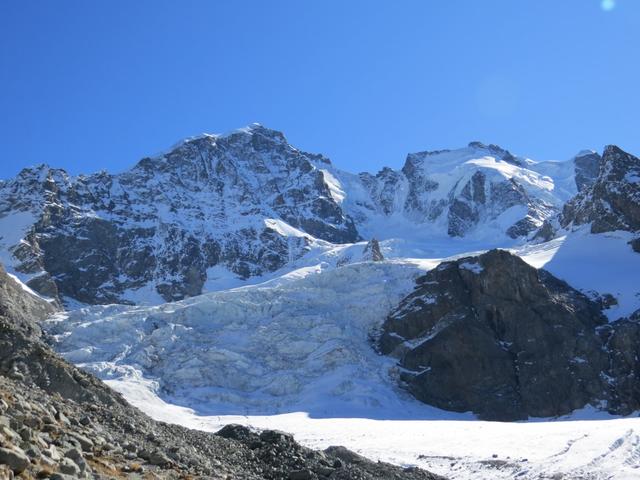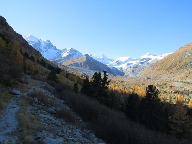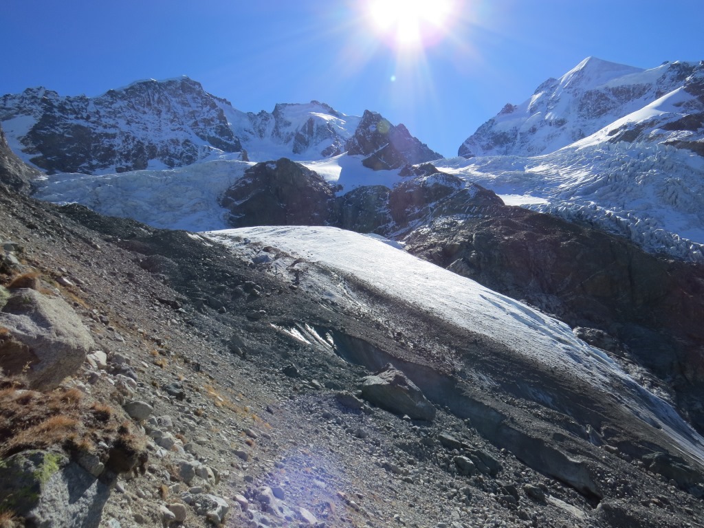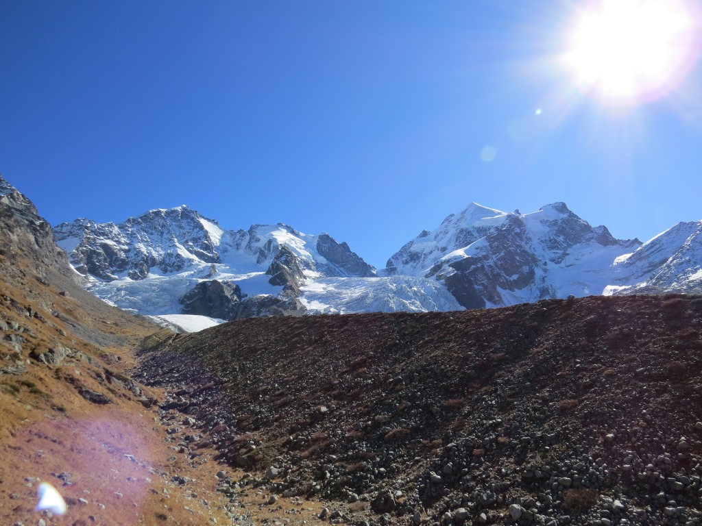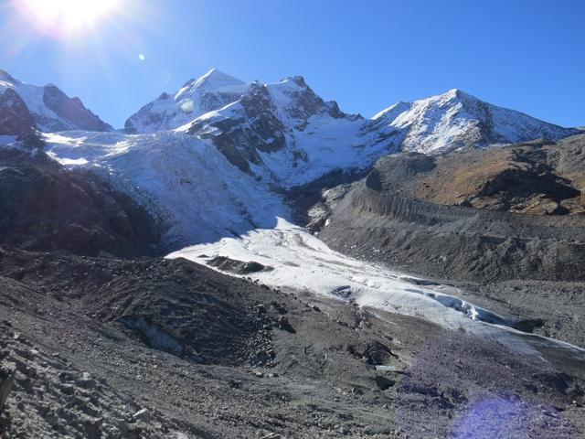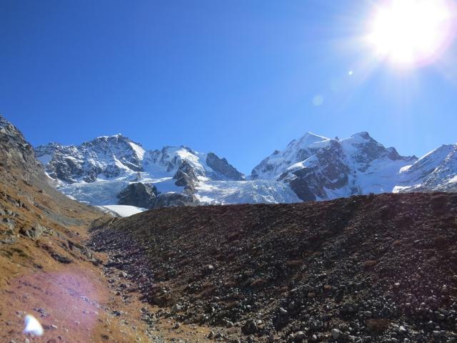 unser Blick schweift über die riesige Seitenmoräne des Vadret da Tschierva zum Il Chapütschin, La Muongia und Piz Glüschaint