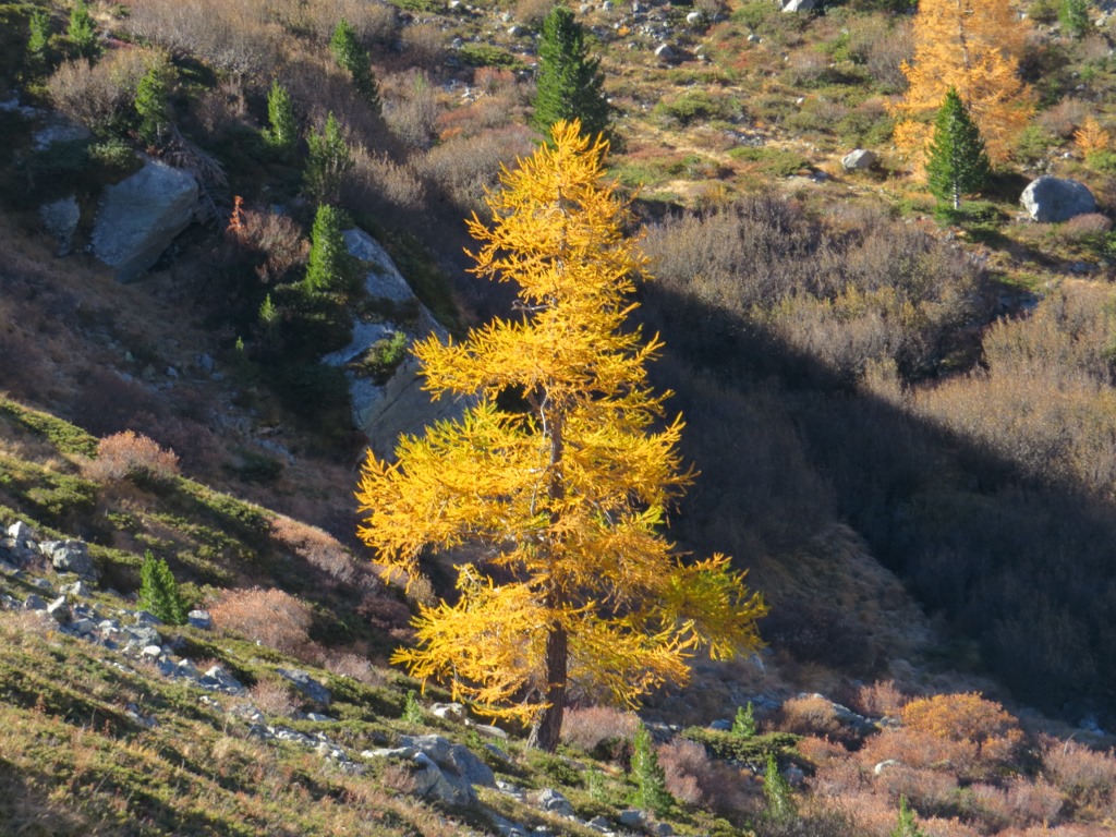 auf der gegenüberliegenden Talseite, färben sich die Lärchen durch die Sonnenstrahlen, in einem gleissenden Goldton