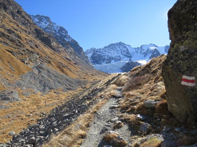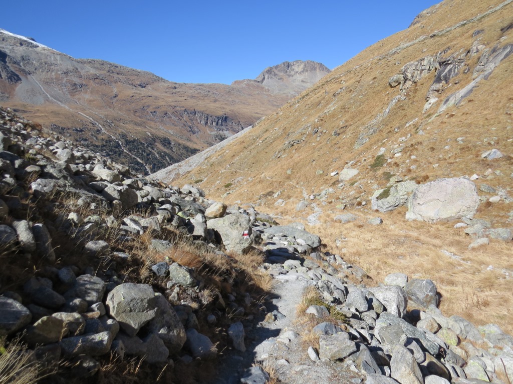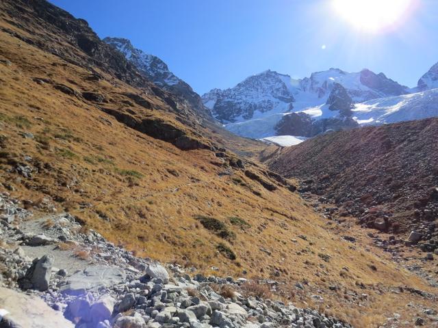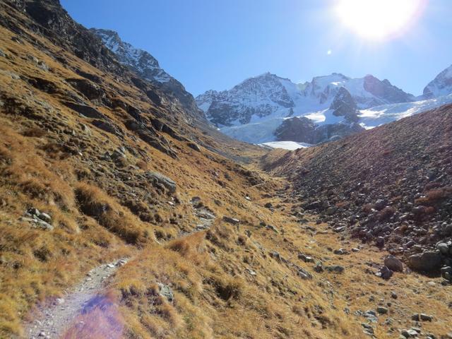 der Bergweg führt uns weiter in der Talmulde, zwischen den steilen Bergflanken des Piz Tschierva...