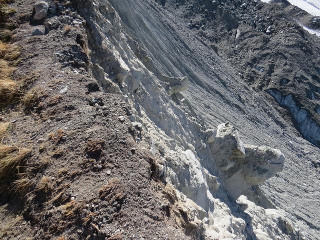 die Seitenmoräne besteht hauptsächlich aus bröseligem Gestein und Sand, Rutschgefahr!