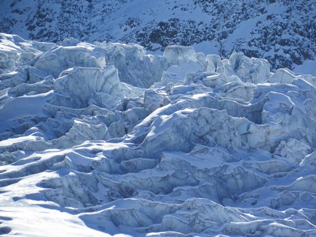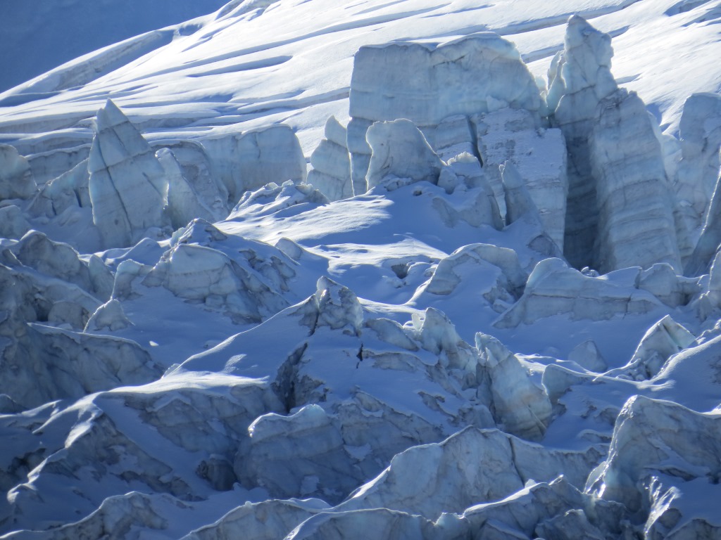 hinter uns Türme aus Gletschereis, die sich an den Abbruchkanten zu stärkeren Hangneigungen von Gletschern bilden