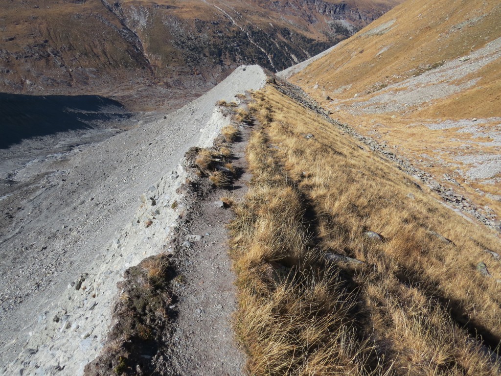 eine Wegspur führt auf den Moränenkamm, doch der Hauptweg bleibt in sicherem Gelände weiter links...
