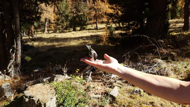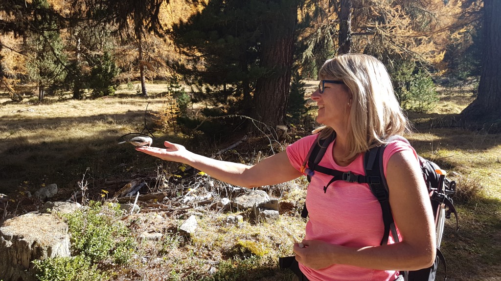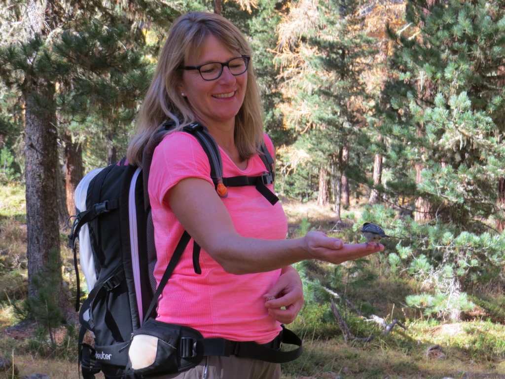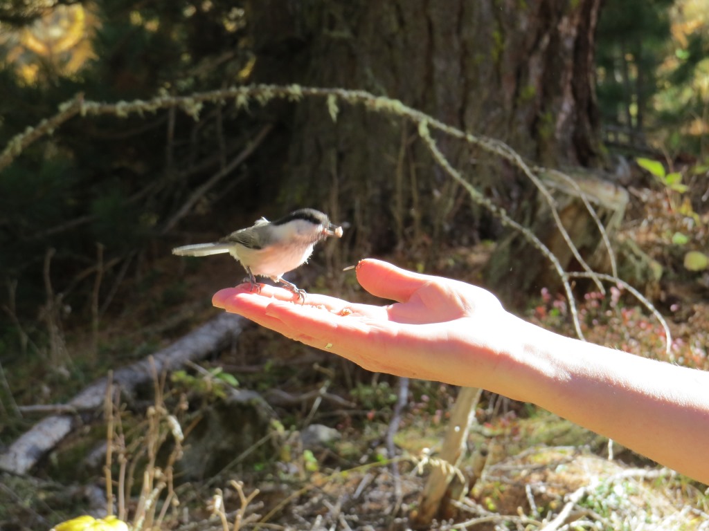 wir können Meisen, Rotkelchen und vor allem Haubenmeisen beobachten, die uns sogar aus der Hand fressen