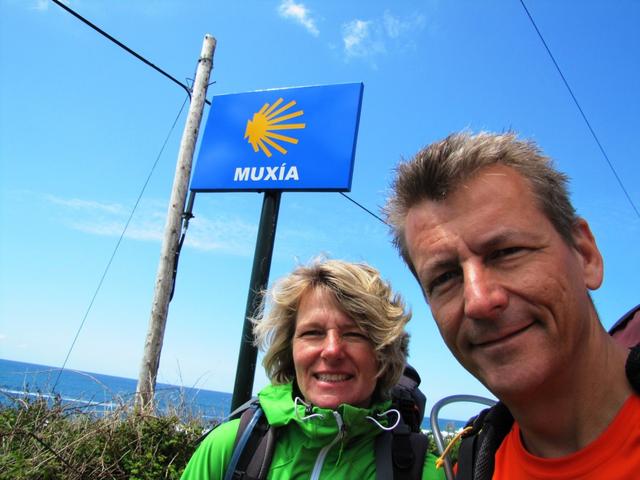 Mäusi und Franco bei der Ortstafel von Muxia Datum 27.10.2013