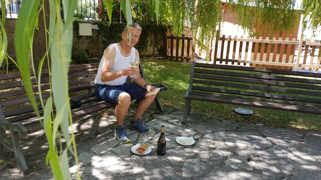 von der Bar holen wir zwei Toast und eine Flasche kühlen hervorragenden Weisswein, und geniessen die Mittagspause...