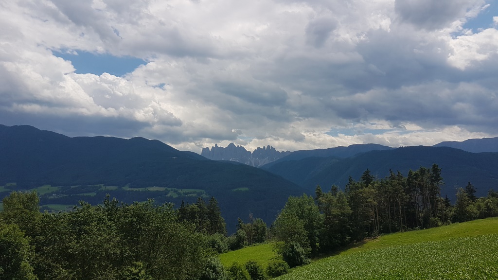 noch einmal blicken wir zurück nach Feldthurns-Velturno. Dahinter türmt sich die Puez-Geisler Gruppe in die Höhe