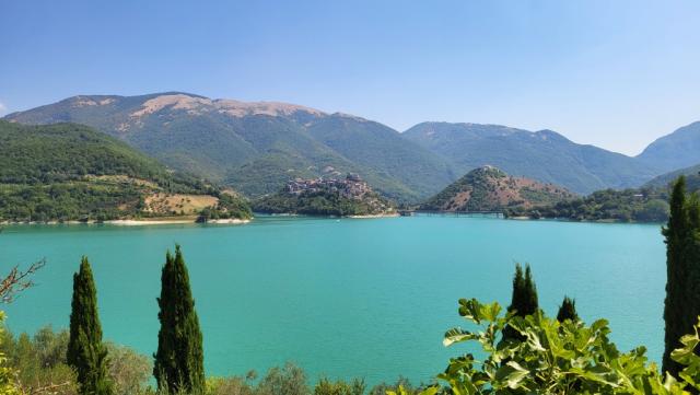 Castel die Tora liegt auf einer Halbinsel im Stausee Lago del Turano, der vom Turano durchflossen wird