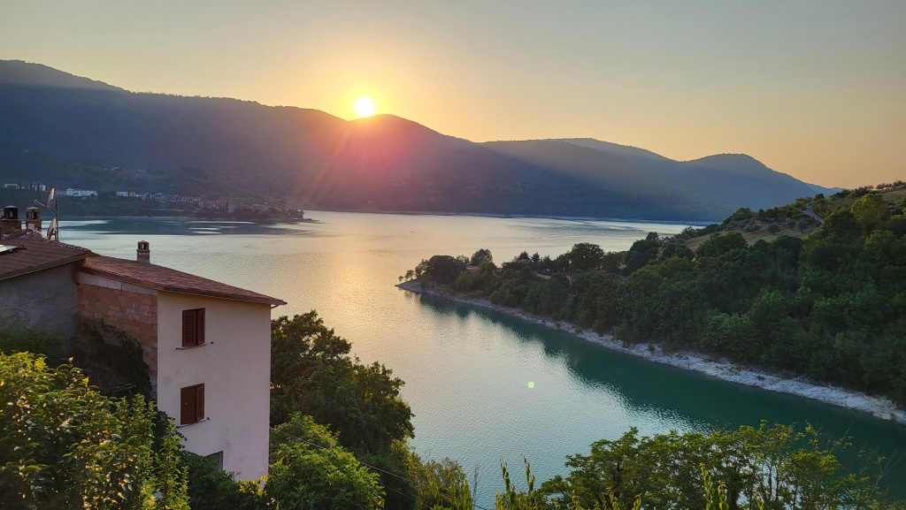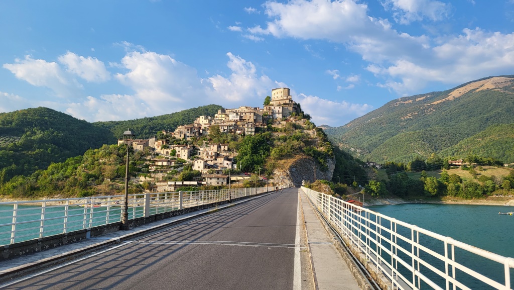 wir überqueren den Lago del Turano. Vor uns das heutige Ziel, das Hügeldorf Castel die Tora
