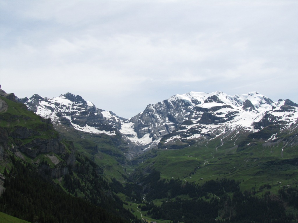 wir verlassen das Dorf Kiental. Am Horizont die schneebedeckte Blüemlisalp