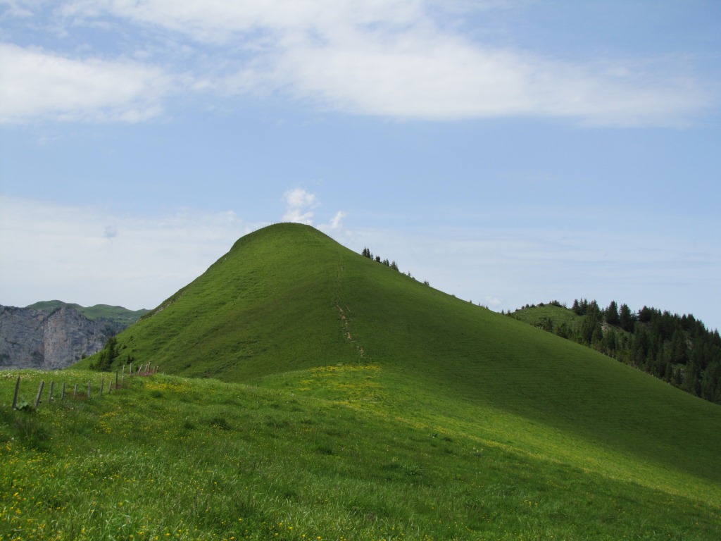 auf einer Bergspitze Alpweiden und eine Alphütte, sieht man selten