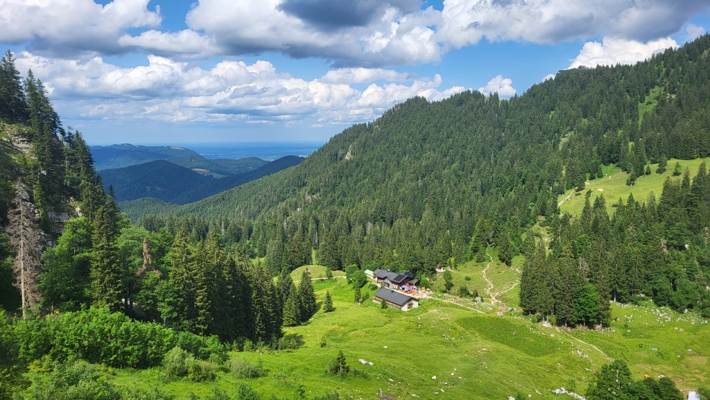 die Staffelalm ist wieder ein wichtiger Wanderweg Knotenpunkt. Am Horizont erkennen wir die Benediktenwand