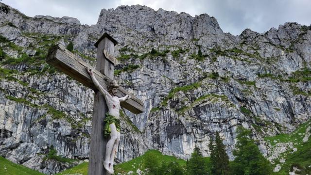 wir haben die Senke "Pessenbacher Schneid" mit dem grossen Holzkreuz erreicht