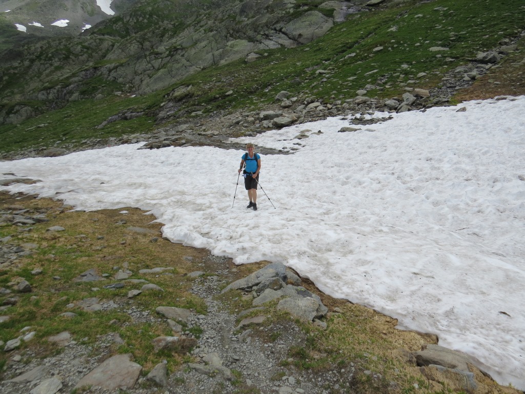 kurz vor dem Pass überqueren wir noch ein Altschneefeld... Datum 28.07.2016