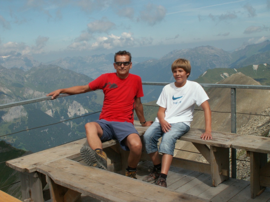 Franco und Göttibub auf der Aussichtsterrasse vom Mountain Lodge beim Segnespass
