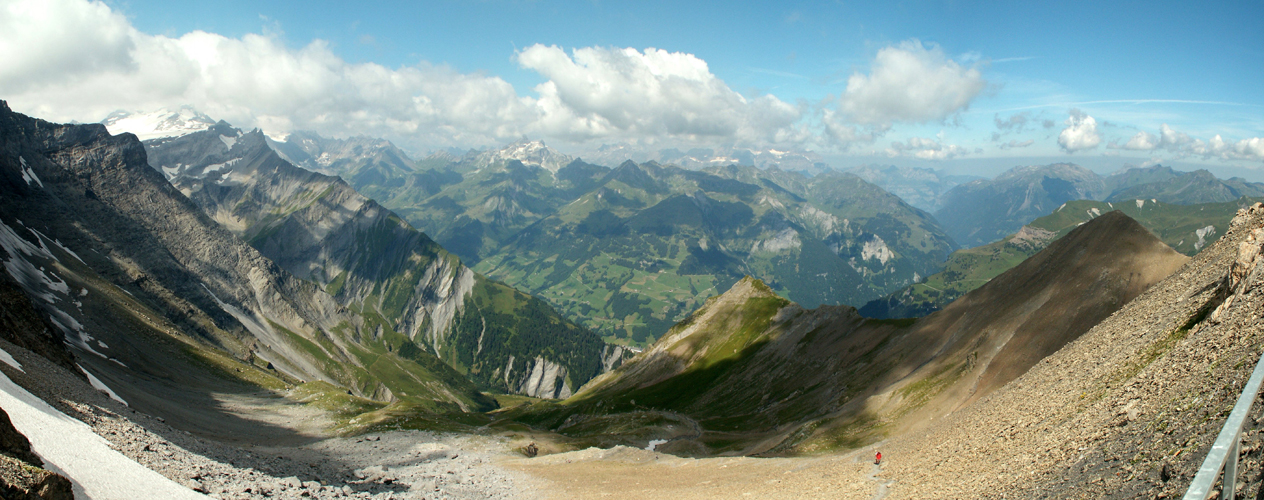 Breitbildfoto vom Segnespass aus gesehen mit Blick Richtung Bündnerseite