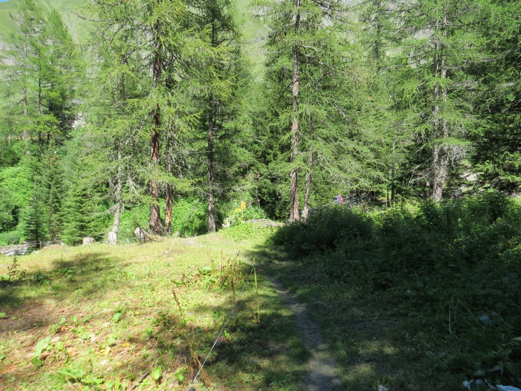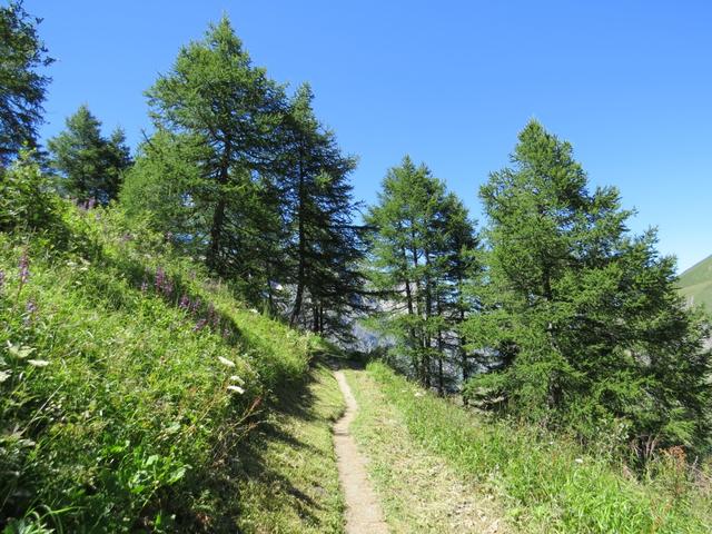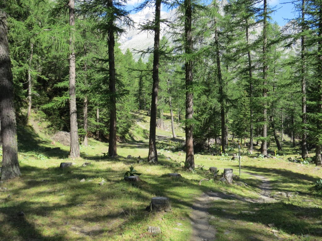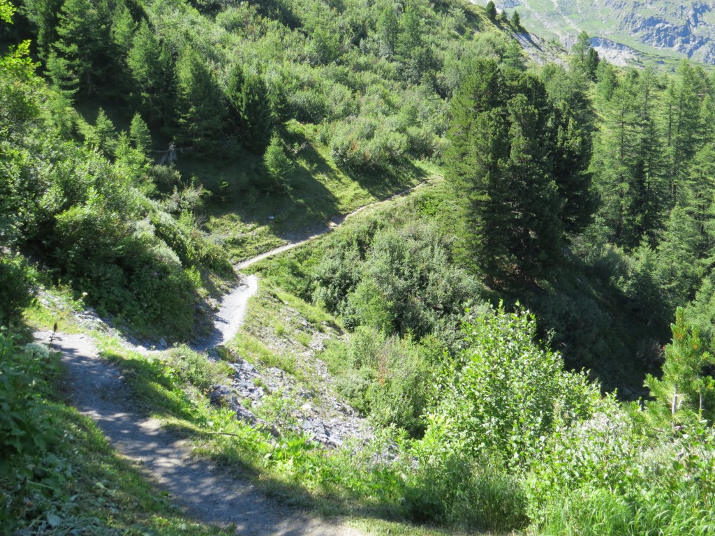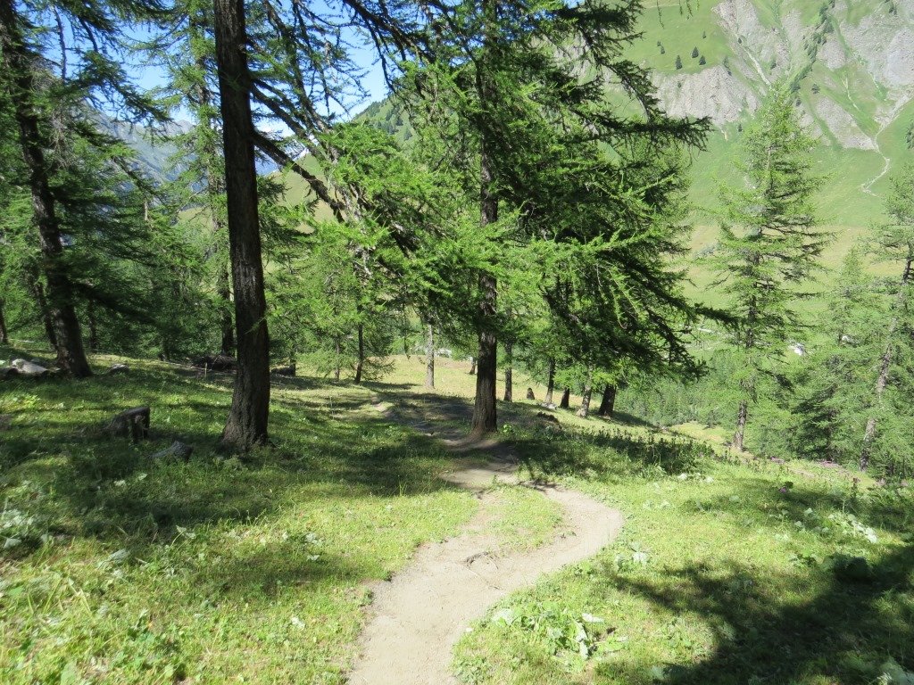 wir biegen rechts ab und verlieren weiterhin durch einen Lärchenwald laufend, über diverse Windungen an Höhe
