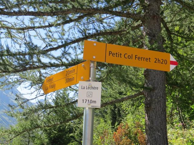 Wegweiser beim grossen Parkplatz bei Ferret 1705 m.ü.M.