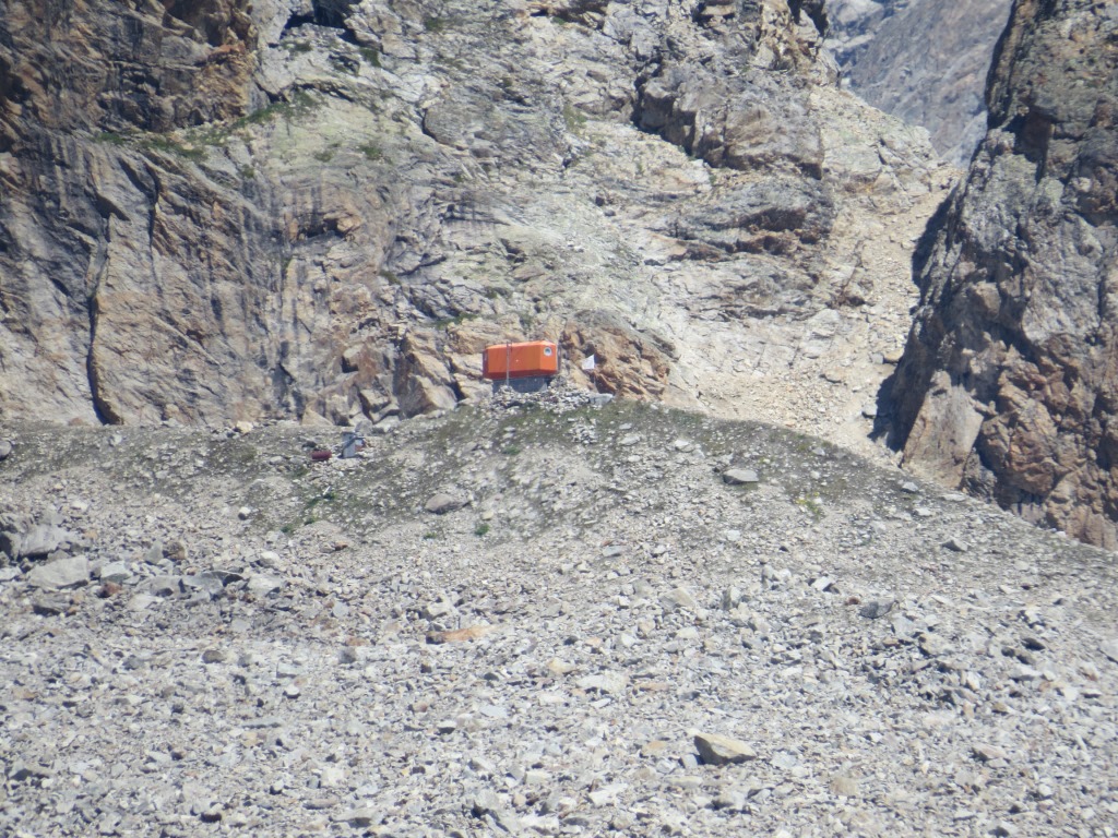 hoch oben über unsere Köpfe, unterhalb des Glacier du Dolent, ist das Biwak du Dolent ersichtlich