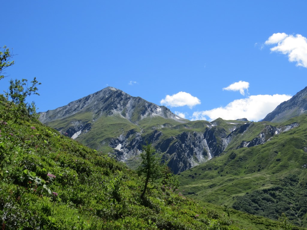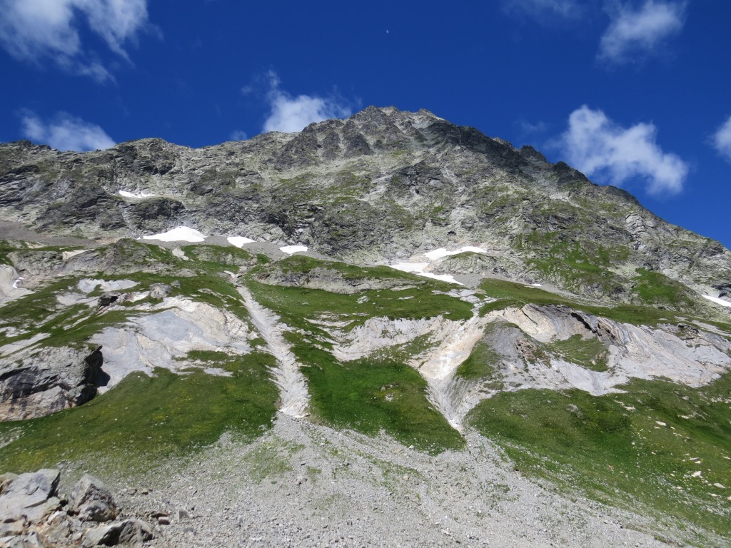 Blick hinauf zur Tête de Ferret. Rechts davon der Petit col Ferret