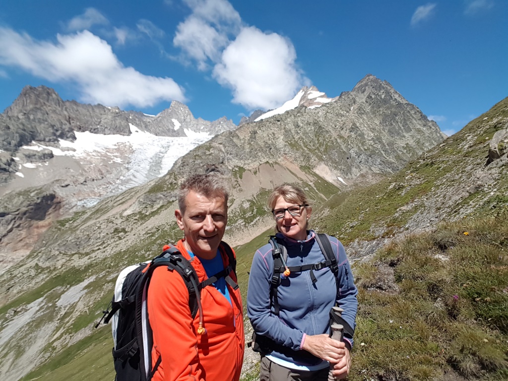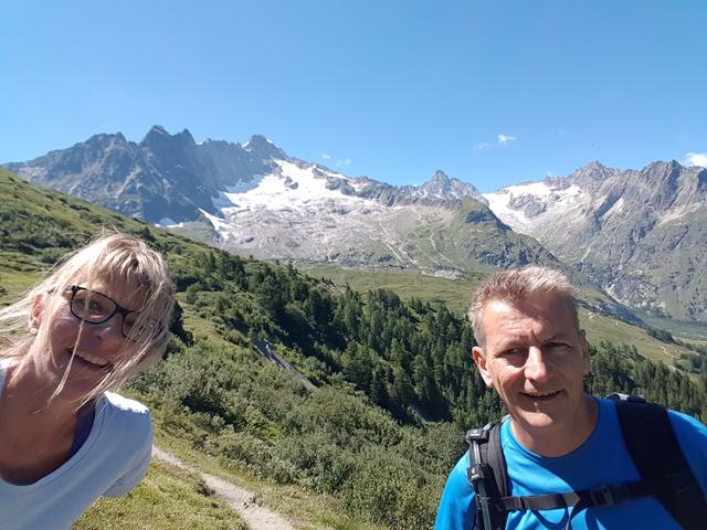 Erinnerungsfoto aufgenommen auf diesem sehr schönen Höhenweg. Im Hintergrund der Mont Dolent und Tour Noir