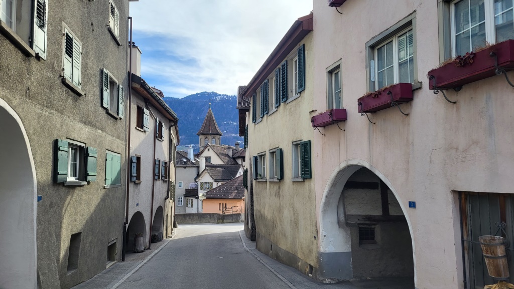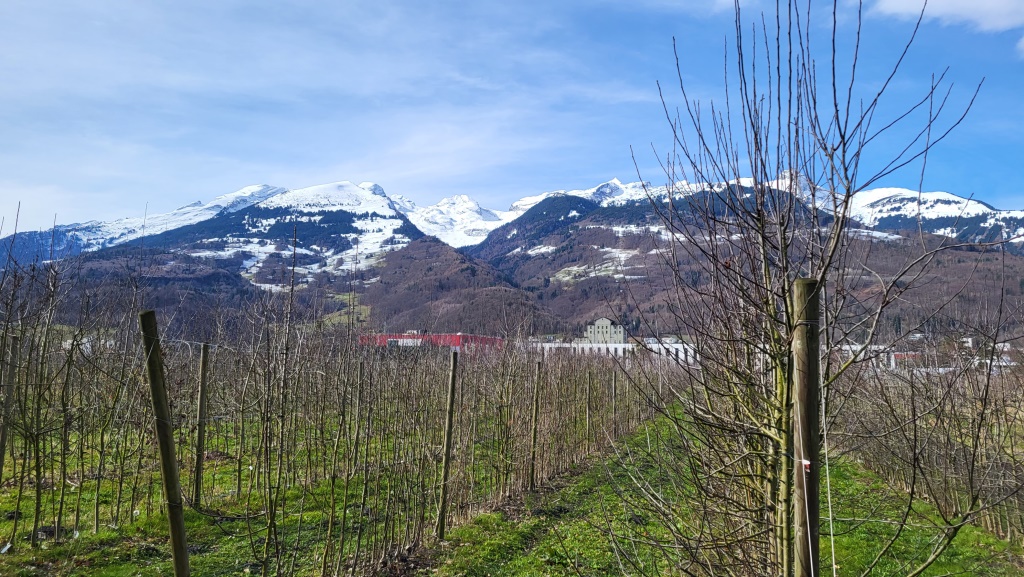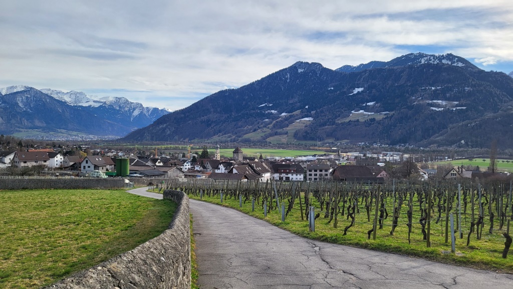 mit Blick auf die verschneiten Berge rund um Buchs, verlassen wir den Dorfkern...
