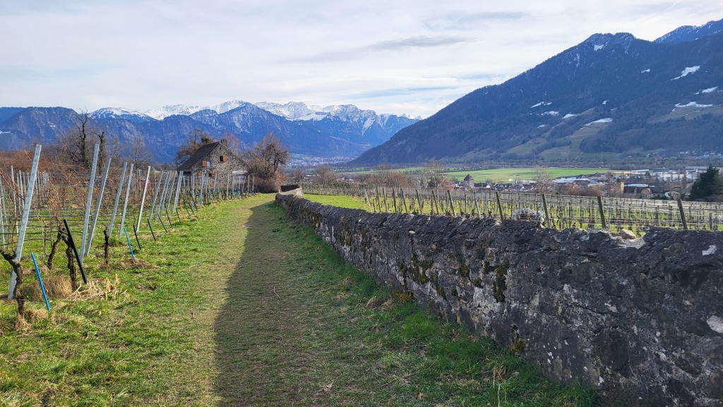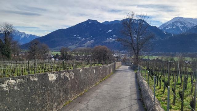 die Via Francisca führt uns nun zwischen dem Fläscher Berg und die Falkniskette leicht aufwärts