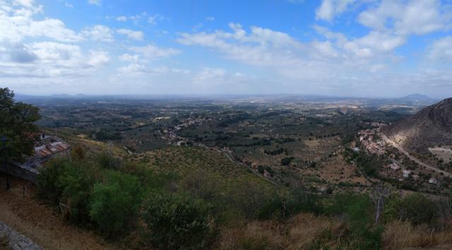 wir blicken zurück auf das auf einen Hügel liegende Fara