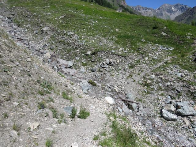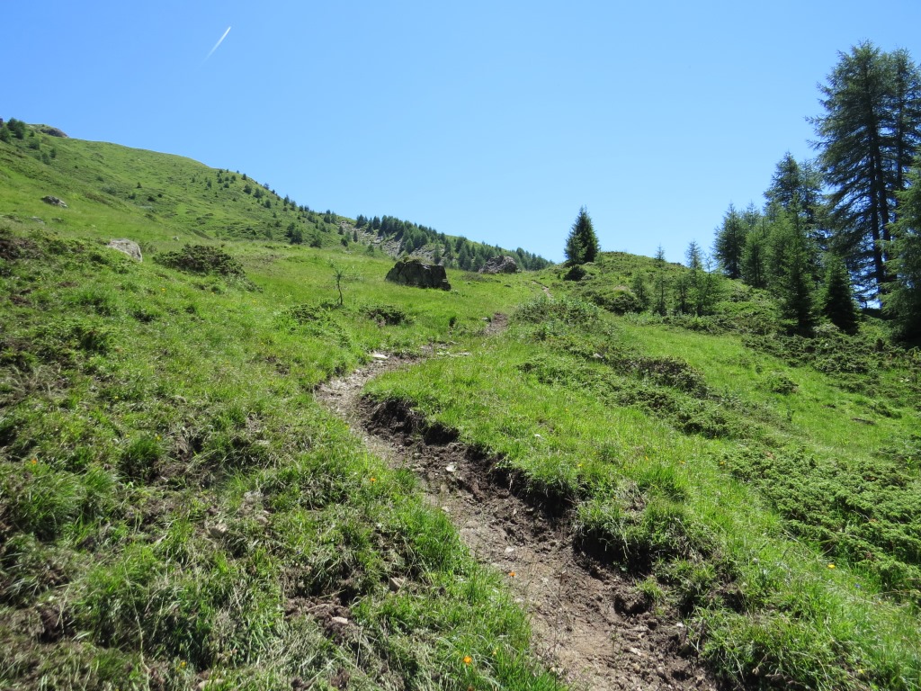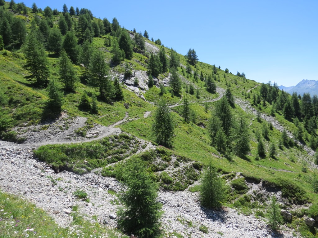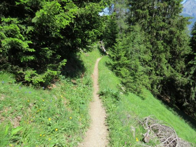 hoch über den Talboden und über der Baumgrenze, geht es in leichtem Auf und Ab Richtung Alp Laret