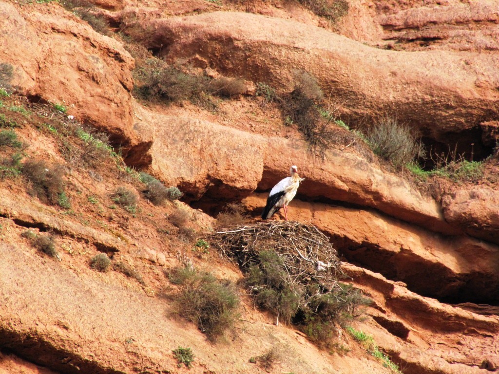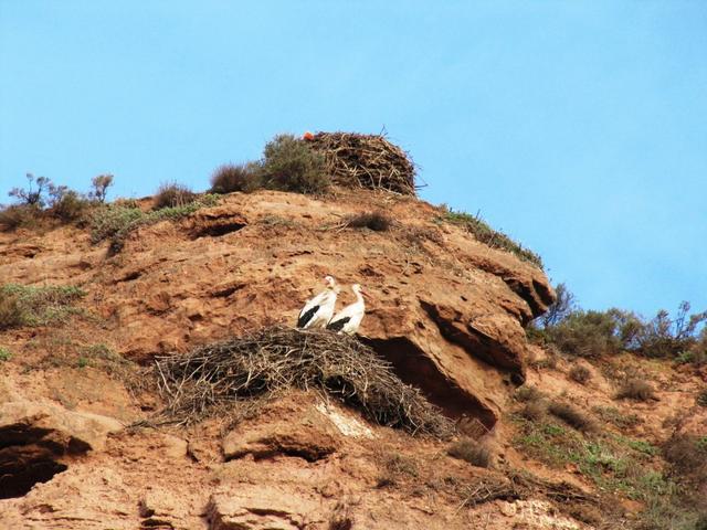 unzählige Storchennester und Störche kleben am roten und steilen Felsen