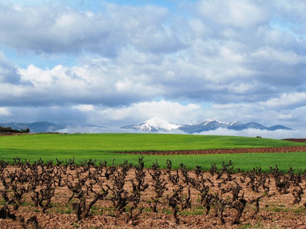 was für ein Farbenspiel. Braune Rebstöcke, grüne Weizenfelder und das schneebedeckte Gebirge der Sierra de la Demanda