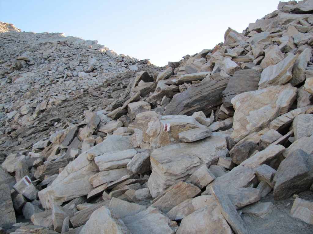 der Bergweg ist nun weiss-rot-weiss markiert und führt über Blockschutt