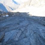 Blick auf den Zwischbergengletscher. Der Gletscher ist mit einer dicken Geröllschicht überdeckt