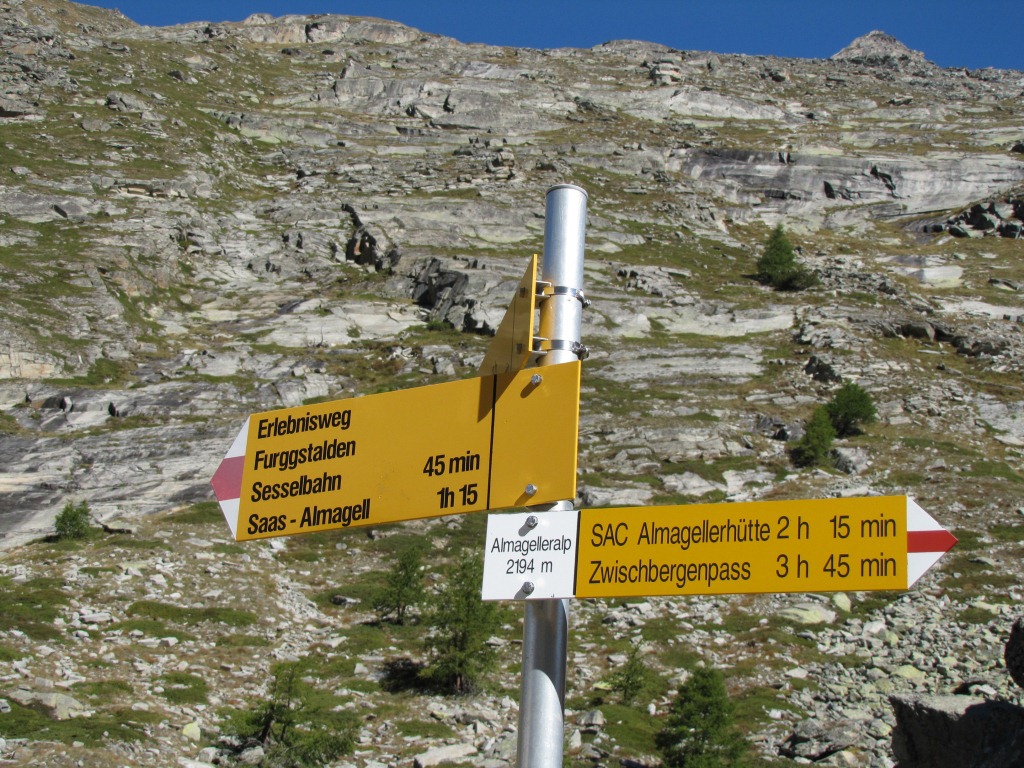 Wegweiser auf der Almagelleralp 2194 m.ü.M. unser Ziel Furggstalden