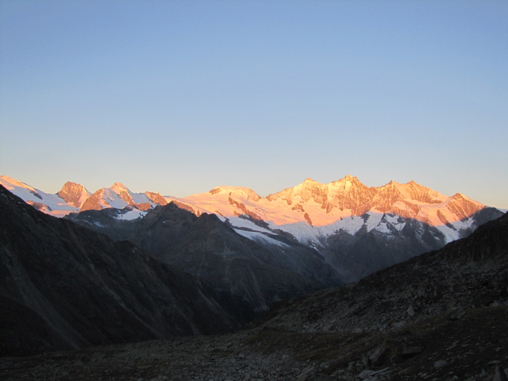 Sonnenaufgang beim Mischabelmassiv. Was für eine traumhafte Aussicht von der Almagellerhütte Datum 27.01.2014