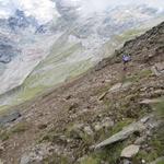 Blick hinauf Richtung Weisshornhütte. Auf dem Bild ist gut ersichtlich, wie steil der Berghang ist