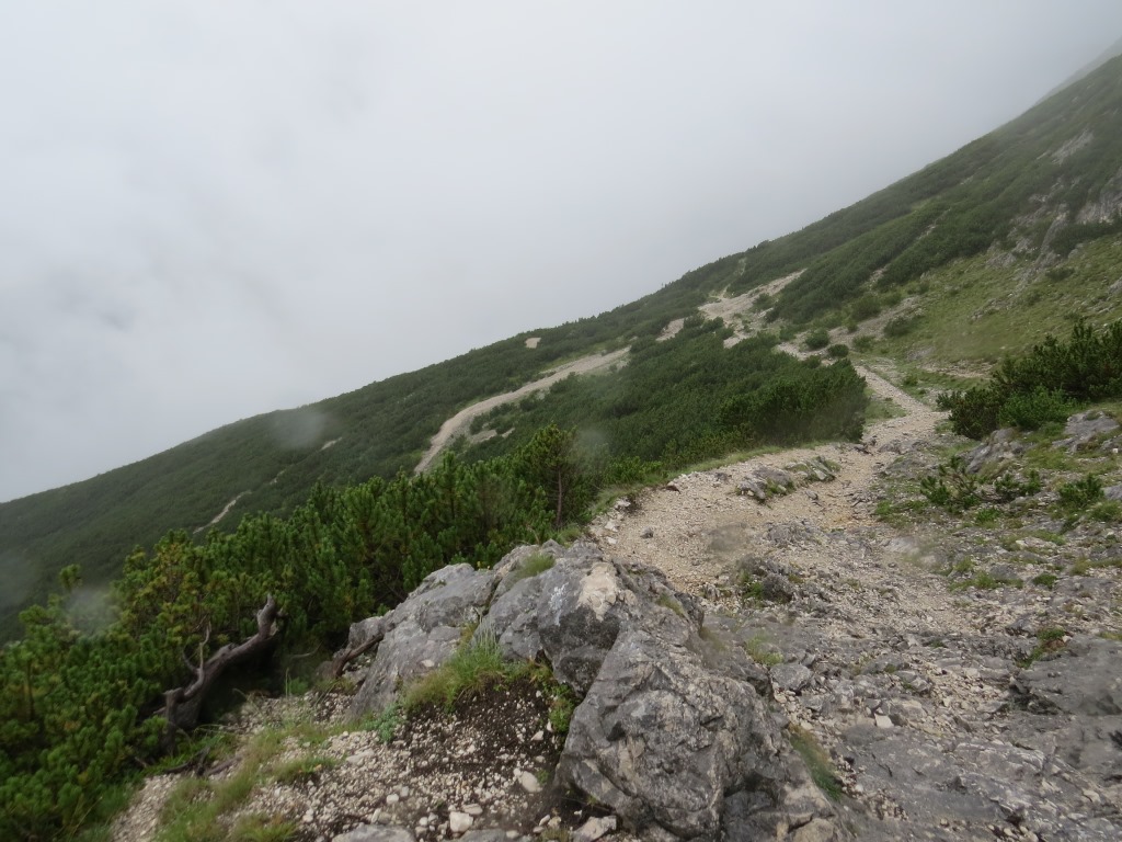 im dichten Nebel führt der Bergpfad aufwärts zum Lafatscherjoch