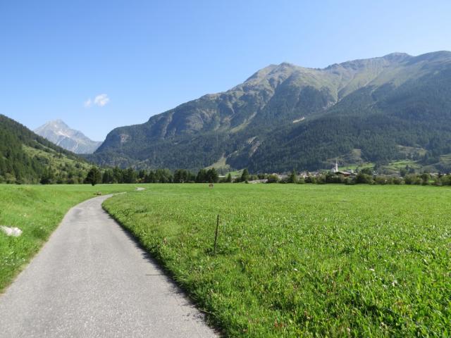 über die Wiesen von Pranun geht es weiter nach Lavin, das vor uns auftaucht