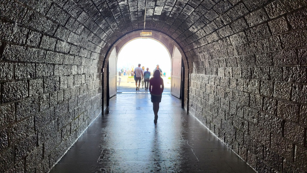 vom Buswendeplatz führt ein 124 m langer und 3 m hoher Tunnel aus Granitquadern zum Aufzug