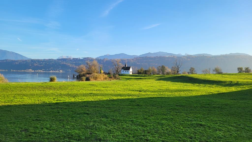 direkt neben der Wirtschaft zum Hof liegt auf einer Landzunge, die frühgotische Kapelle St. Meinrad