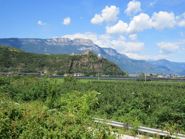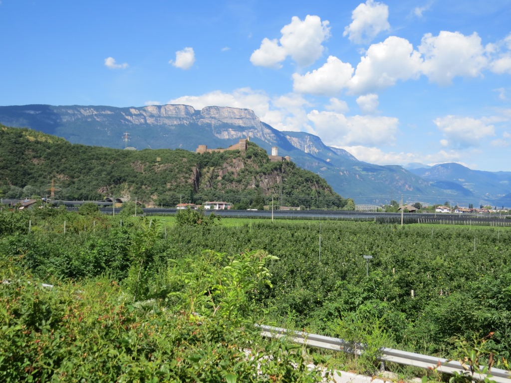 vor uns taucht auf dem Hügel thronend, die Burg Sigmundskron auf Datum 06.06.2023