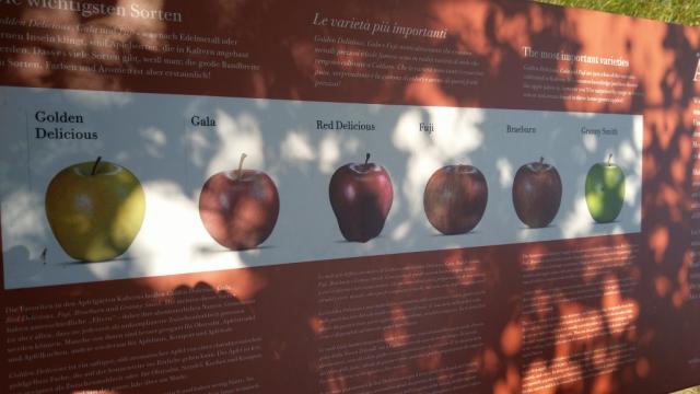 Infotafeln erklären uns die Apfelsorten die in dieser Gegend angepflanzt werden Datum 06.06.2023