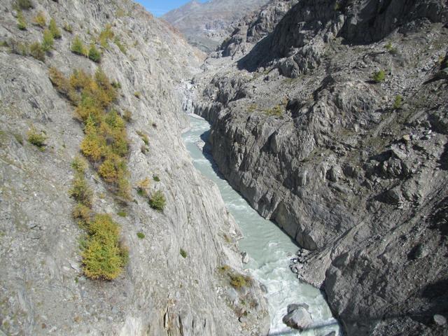 Tiefblick in die Massaschlucht mit Gletscherbach. Wahnsinnig wieviel Wasser vom Aletschgebiet hier runter kommt Datum 18.01.2012