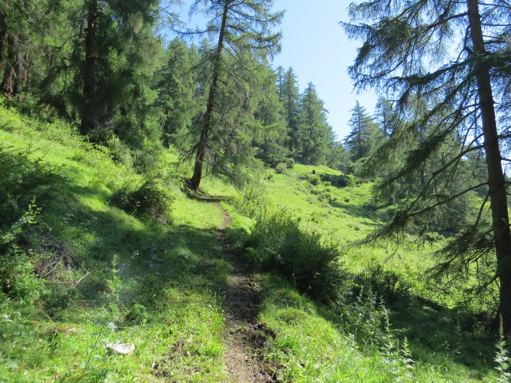 hoch über den Talboden und über der Baumgrenze, geht es in leichtem Auf und Ab Richtung Alp Laret