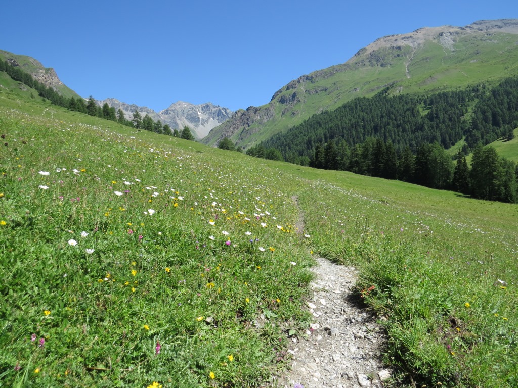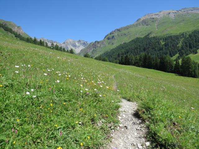 auf der orografisch rechten Talseite geht es über Blumenwiesen weiter taleinwärts