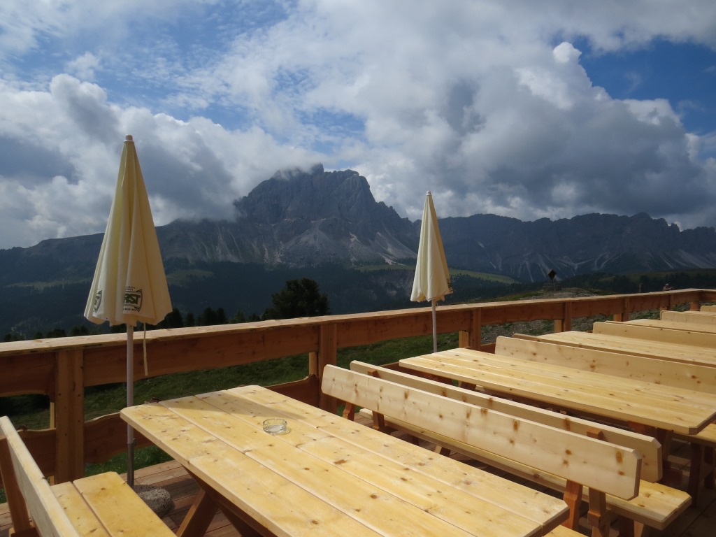 was für eine Aussicht von der Terrasse aus. Direkt vor uns steht der Peitlerkofel