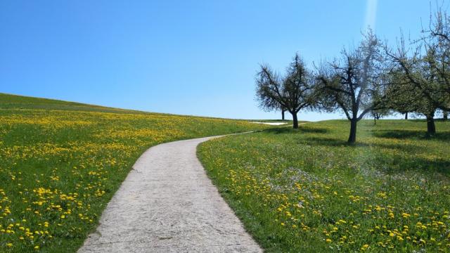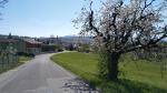 der Kapellenweg führt an blühende Obstplantagen vorbei
