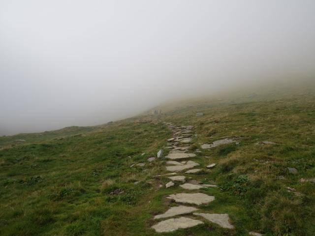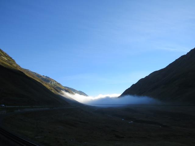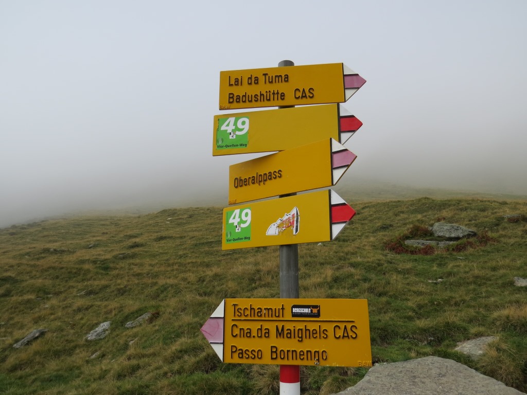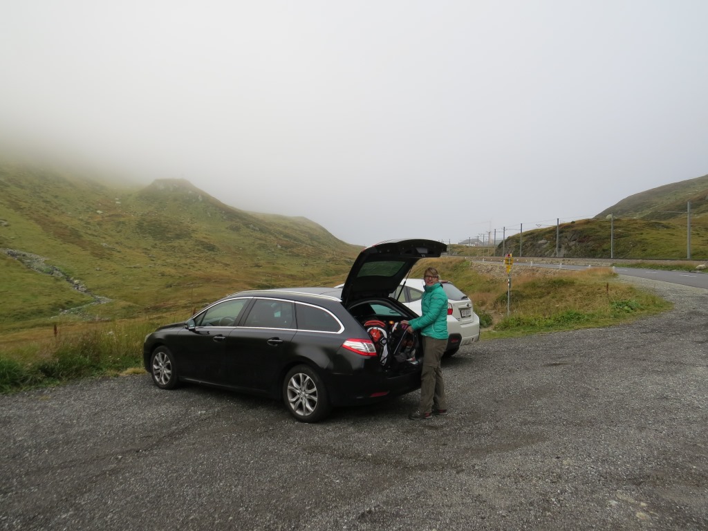 beim Oberalppass empfängt uns dichter Nebel. Bei der ersten Kurve nach dem Pass Punkt 1987 m.ü.M. parkieren wir das Auto