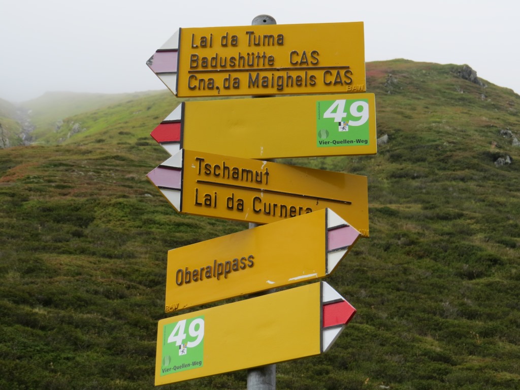 Wegweiser beim Parkplatz. Der Lai da Tuma ist unser erstes Ziel