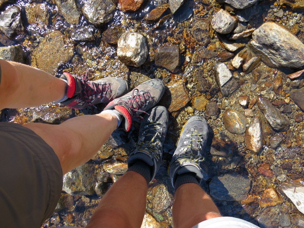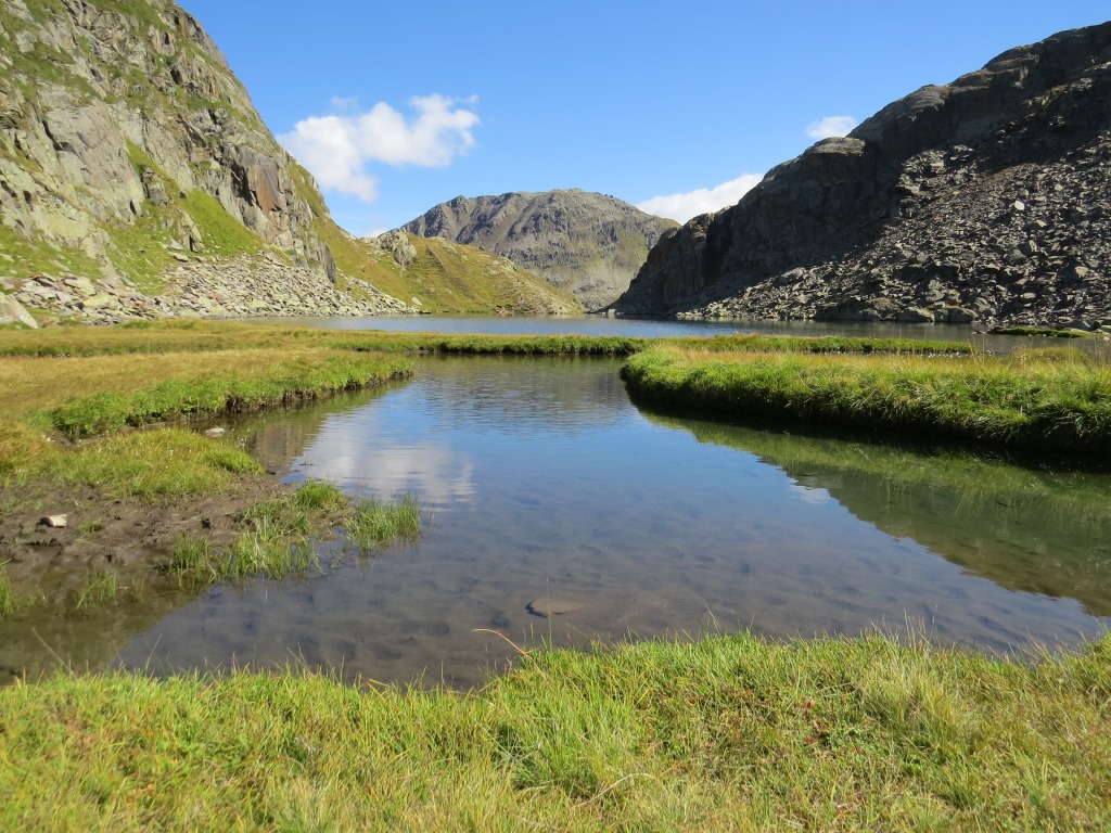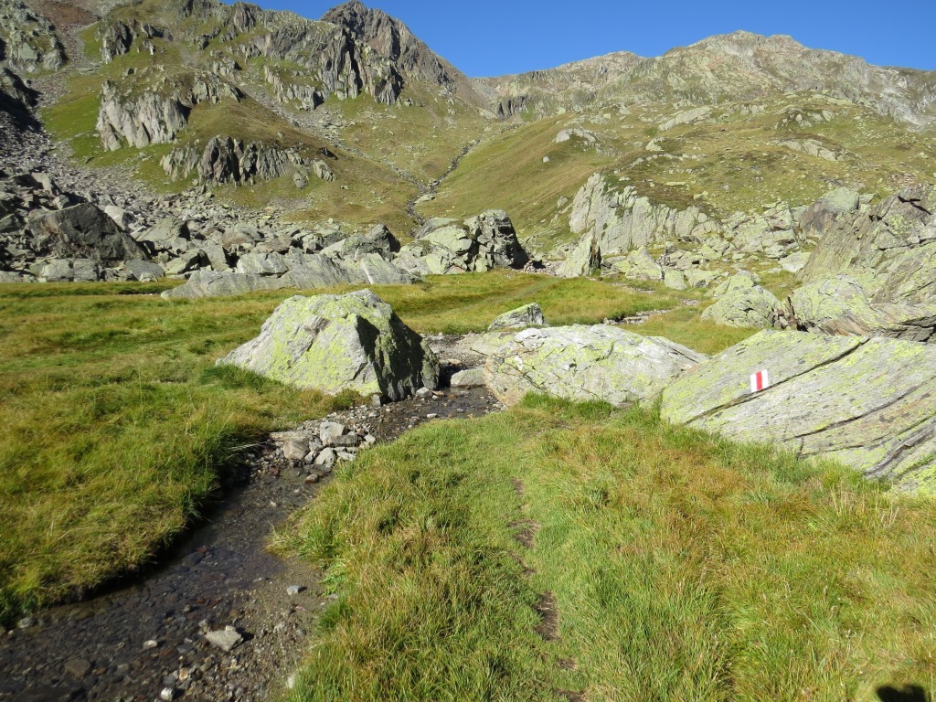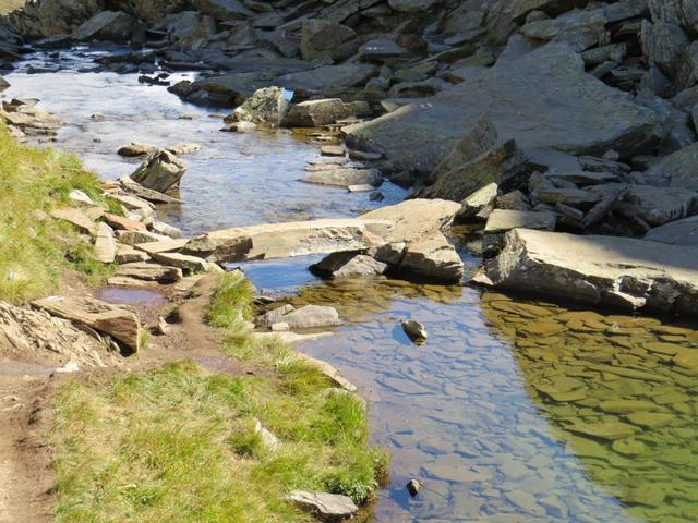 wir laufen aber nicht zur Weggabelung Punkt 2351 m.ü.M. hinauf, sondern biegen rechts ab, wo das Wasser den Tomasee verlässt