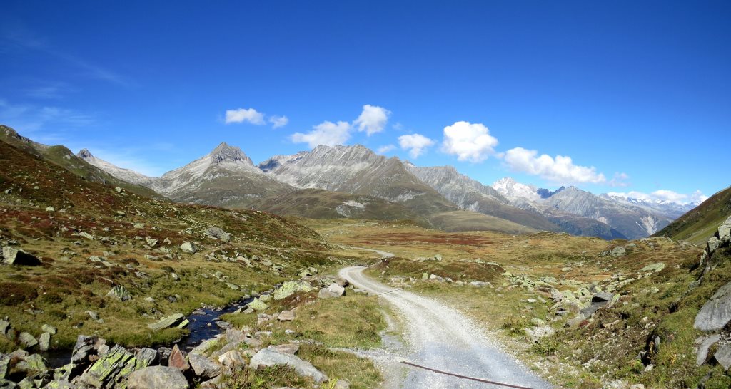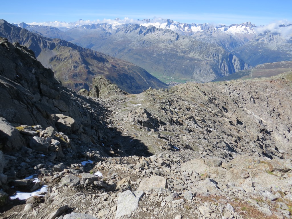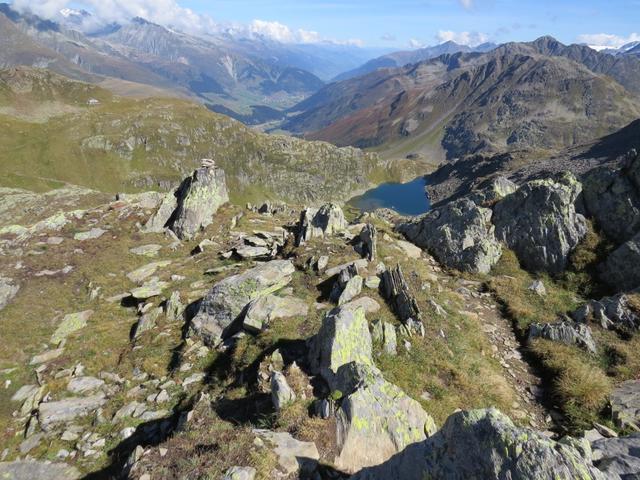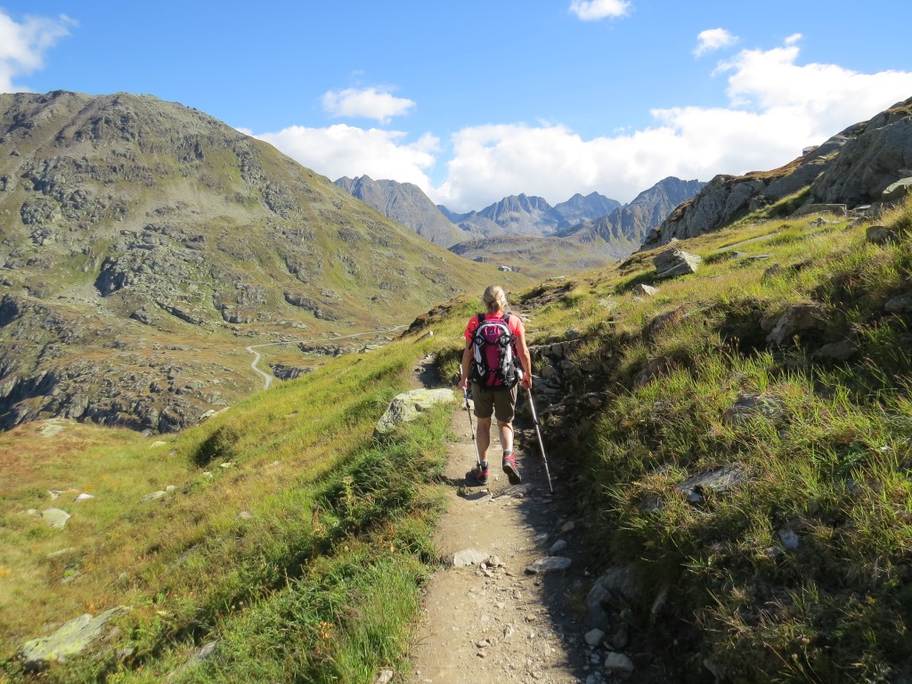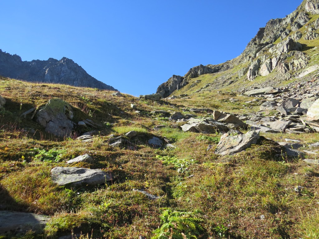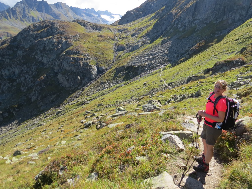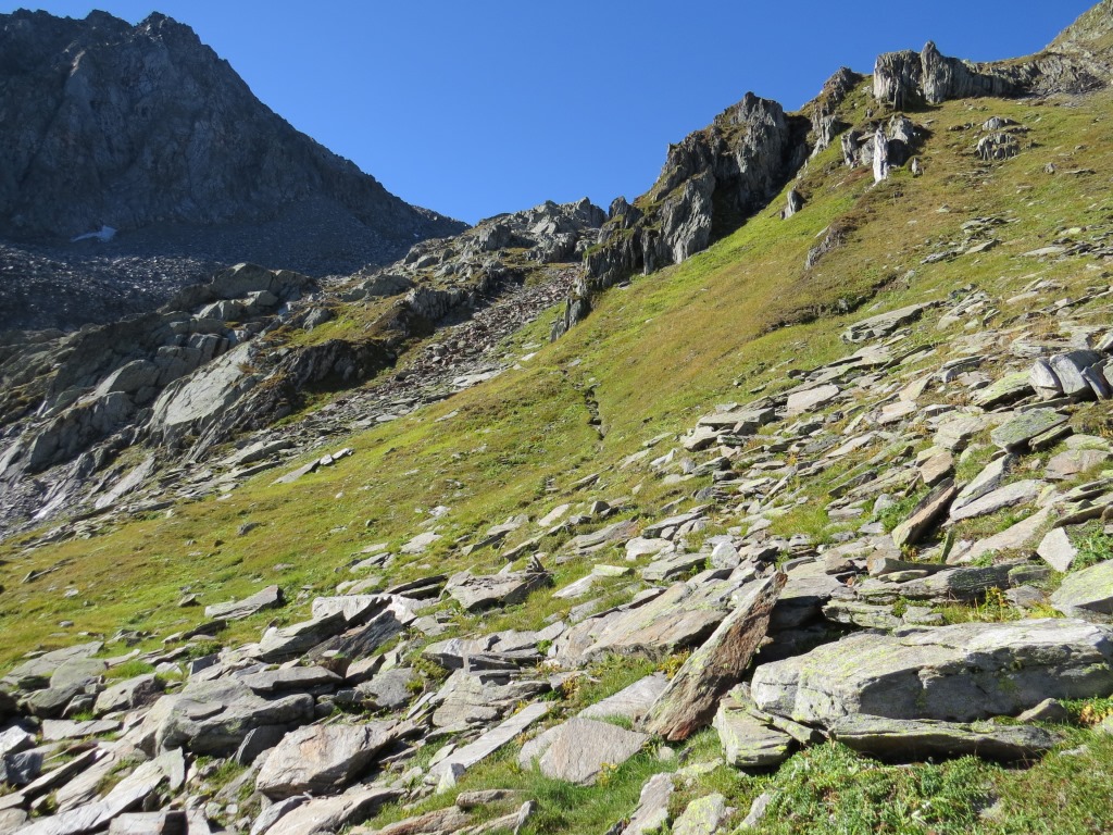 auf dem gleichen Höhenweg wandern wir an der Ostflanke des Pazzolastocks zu unserem Auto zurück